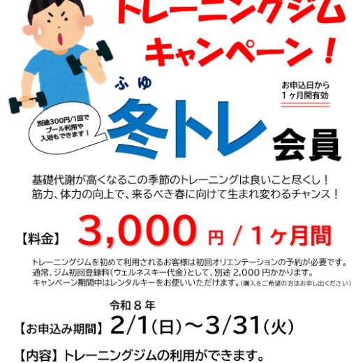 トレーニングジム利用時間変更のお知らせ【期間限定】13:00から利用可...